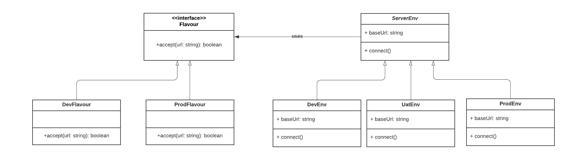 dev와 prod flavour가 있고, Dev, UAT, PROD 환경이 있다고 하자. 그렇다면 다음과 같은 형태로 클래스를 설계해 볼 수 있을 것이다.
